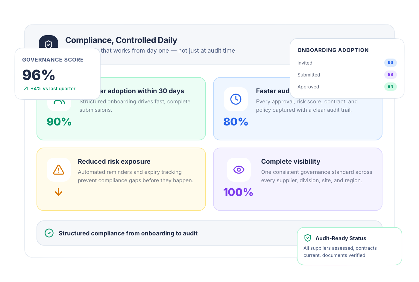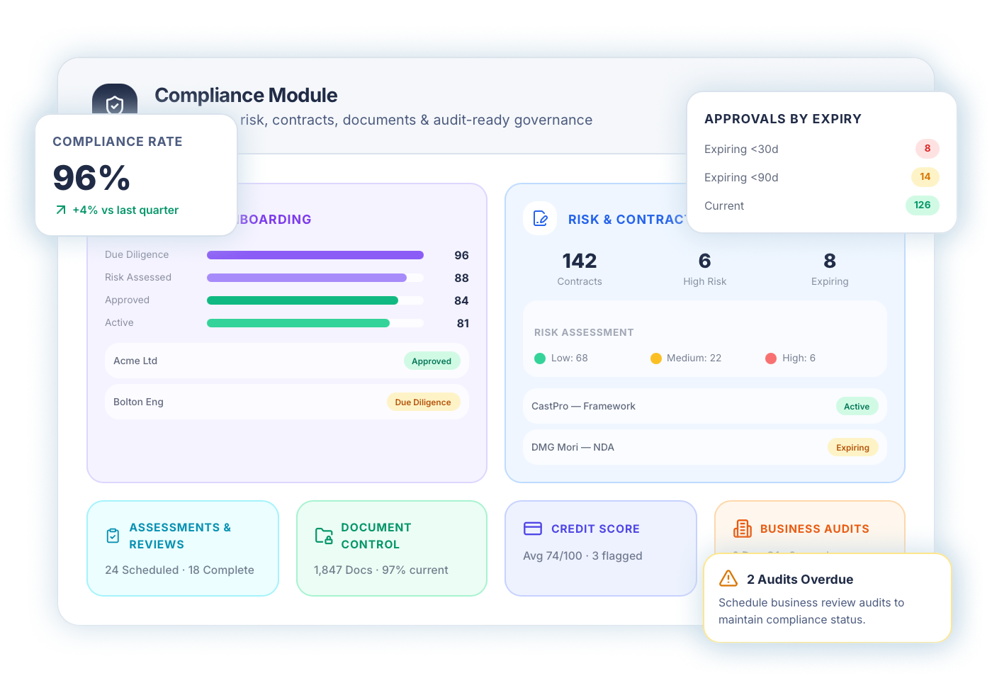 Move compliance from reactive reporting to structured control. Embed onboarding, risk-based approvals, expiry tracking, and audit trails into everyday workflows and stay compliant by design.