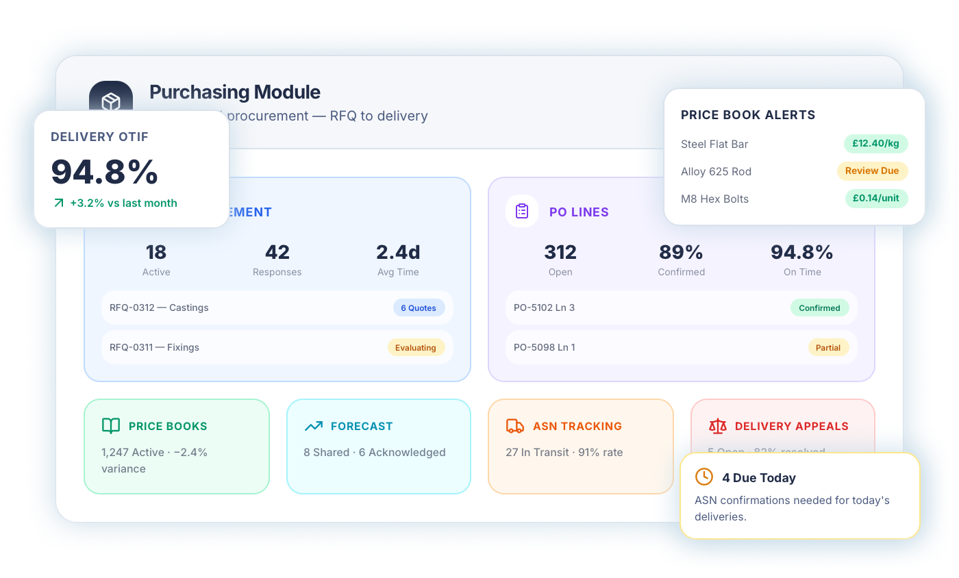 Discover how the Purchasing Module helps procurement teams manage the full procurement lifecycle, from RFQs and price book alignment to forecast sharing, expediting, ASN tracking and delivery appeals, reducing cost variance, improving OTIF performance and strengthening supplier collaboration