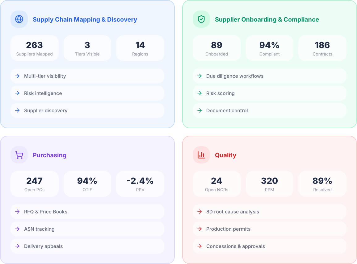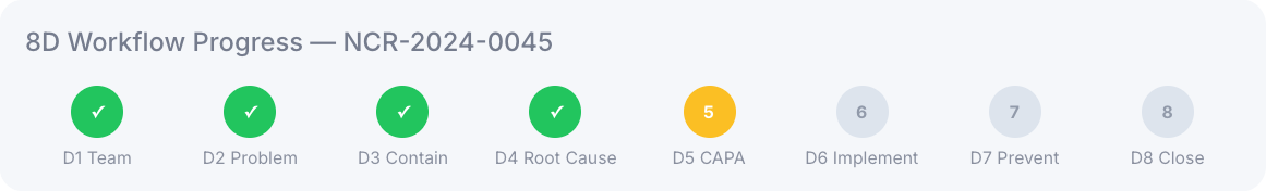 Full 8D methodology is enforced, with corrective and preventative actions defined, target dates monitored, and approval workflows captured. Recurring fault codes are tracked across suppliers and sites to identify repeat issues early.